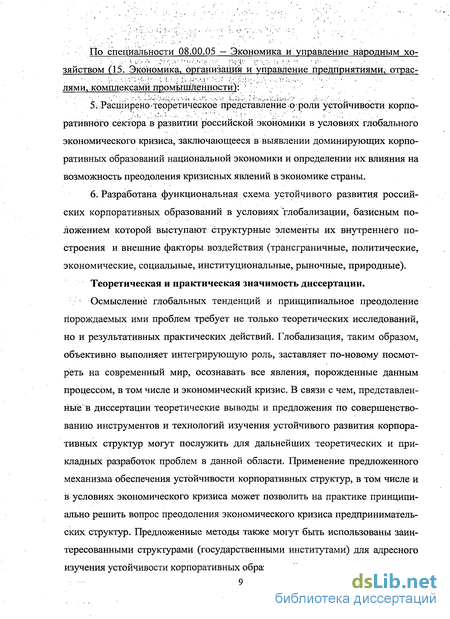 Расширено-теоретическое представление о роли устойчивости корпоративного сектора в развитии российской экономики в условиях глобального экономического кризиса, заключающееся в выявлении доминирующих корпоративных образований национальной экономики и определении их влияния на возможность преодоления кризисных явлений в экономике страны.
