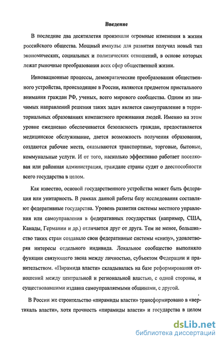 Инновационные процессы, демократические преобразования общественного устройства, происходящие в России, являются предметом пристального внимания граждан РФ, ученых, всего мирового сообщества. Одним из значимых направлений решения таких задач является самоуправление в территориальных образованиях компактного проживания людей. Именно на этом уровне ежедневно обеспечивается безопасность граждан, предоставляется медицинское обслуживание, дается возможность получения образования, создаются рабочие места, оказываются транспортные, торговые, бытовые, коммунальные услуги. И от того, насколько эффективно работает поселковая или районная администрация, граждане страны судят о дееспособности всего государства в целом.