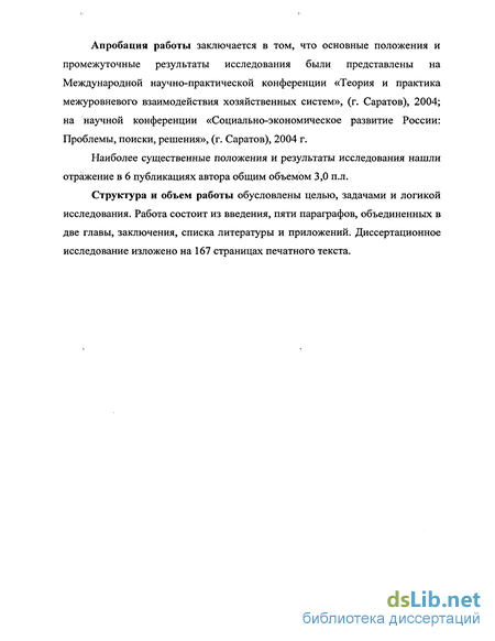 Апробация работы заключается в том, что основные положения и промежуточные результаты исследования были представлены на Международной научно-практической конференции «Теория и практика межуровневого взаимодействия хозяйственных систем», (г. Саратов), 2004; на научной конференции «Социально-экономическое развитие России: Проблемы, поиски, решения», (г. Саратов), 2004 г.