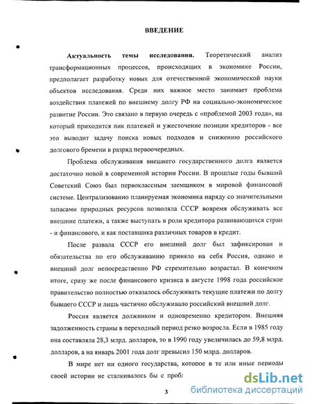 Актуальность темы исследования. Теоретический анализ трансформационных процессов, происходящих в экономике России, предполагает разработку новых для отечественной экономической науки объектов исследования. Среди них важное место занимает проблема воздействия платежей по внешнему долгу РФ на социально-экономическое развитие России. Это связано в первую очередь с «проблемой 2003 года», на который приходится пик платежей и ужесточение позиции кредиторов - все это выводит задачу поиска новых подходов и снижению российского долгового бремени в разряд первоочередных.