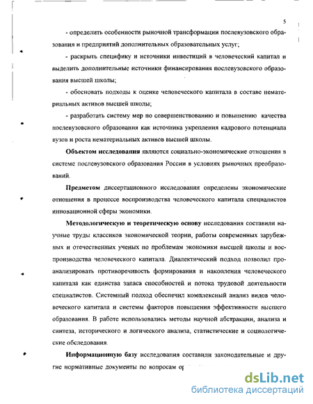 Методологическую и теоретическую основу исследования составили научные труды классиков экономической теории, работы современных зарубежных и отечественных ученых по проблемам экономики высшей школы и воспроизводства человеческого капитала. Диалектический подход позволил проанализировать противоречивость формирования и накопления человеческого капитала как единства запаса способностей, и потока трудовой деятельности специалистов. Системный подход обеспечил комплексный анализ видов человеческого капитала и системы факторов повышения эффективности высшего образования, В работе использовались методы научной абстракции, анализа и синтеза, исторического и логического анализа, статистические и социологические обследования.
