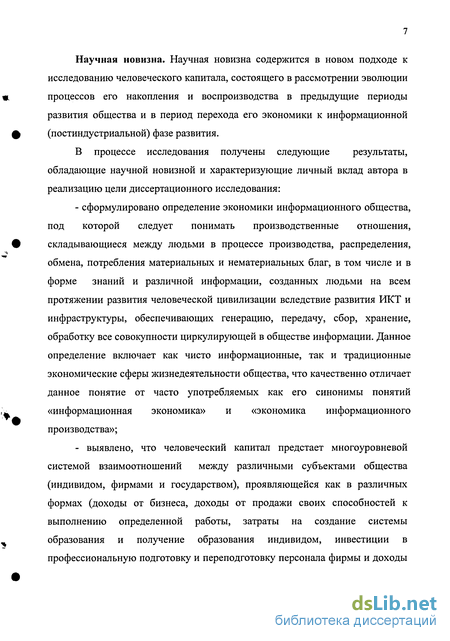 Научная новизна. Научная новизна содержится в новом подходе к исследованию человеческого капитала, состоящего в рассмотрении эволюции процессов его накопления и воспроизводства в предыдущие периоды развития общества и в период перехода его экономики к информационной (постиндустриальной) фазе развития.
