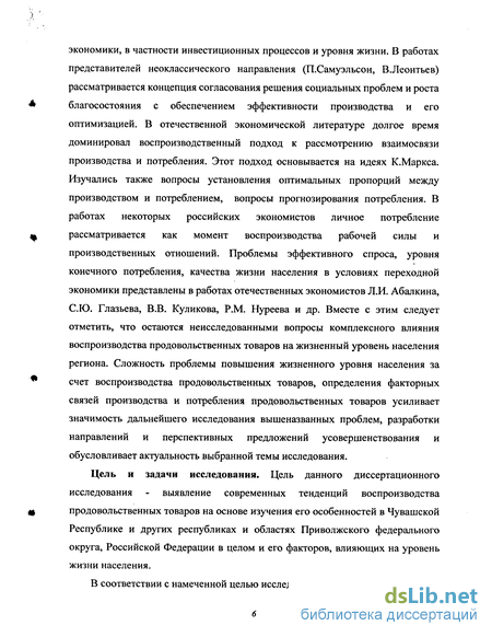 Степень разработанности проблемы. Исследования воспроизводственных процессов и определения уровня жизни населения в той или иной мере проводились в основных школах экономической мысли. В XIX столетии К.Маркс разработал концепцию неравномерного развития процесса воспроизводства. Он считал, что любой, постоянно возобновляющийся общественный процесс производства, является в то же время процессом воспроизводства. Им же был определен необходимый уровень дохода работающего человека: его заработная плата должна обеспечивать питание, одежду, жилищные условия и возможность обучиться профессиональным навыкам не только ему самому, но и членам его семьи. Исследования сущности потребностей человека, закономерности их развития, взаимосвязей производства и потребления, вопросов повышения жизненного уровня приведены в трудах П.Самуэльсона, Дж.Кейнса, Й.Шумпетера, А.Пигу, В.Леонтьева, А.Маршалла, М.Фридмана. Немалый вклад в изучение этих проблем внесли отечественные экономисты: А.В. Чаянов, М.И. Туган-Барановский, Л.И. Абалкин, С.С. Шаталин, Т.И. Заславская, Б.В. Ракитский, Н.М. Римашевская, В.Н. Бобков, В.В. Гусев. Авторы рассматривают не только теоретические аспекты воспроизводственных процессов и факторного анализа уровня жизни населения, но и исследуют проблемы продовольственного обеспечения населения, решения социальных вопросов. Интерес представляет теория народонаселения Т.Р. Мальтуса, в которой определен порядок соотношения между динамикой населения и средств существования, отмечено несоответствие между ростом населения и производством продовольствия. Особое внимание изучению вопросов потребления и динамики совокупного спроса уделено Дж.М. Кейнсом, который показал взаимосвязи доходов, инвестиционного спроса и совокупного потребительского спроса. Им также были рассмотрены проблемы государственного регулирования этих взаимосвязей в национальной экономике. Европейская школа посткейнсианского направления (Ф.Перру и др.) основывалась на идее применения индикативного планирования и государственного регулирования экономики, в частности инвестиционных процессов и уровня жизни. В работах представителей неоклассического направления (П.Самуэльсон, В.Леонтьев) рассматривается концепция согласования решения социальных проблем и роста благосостояния с обеспечением эффективности производства и его оптимизацией. В отечественной экономической литературе долгое время доминировал воспроизводственный подход к рассмотрению взаимосвязи производства и потребления. Этот подход основывается на идеях К.Маркса. Изучались также вопросы установления оптимальных пропорций между производством и потреблением, вопросы прогнозирования потребления. В работах некоторых российских экономистов личное потребление рассматривается как момент воспроизводства рабочей силы и производственных отношений. Проблемы эффективного спроса, уровня конечного потребления, качества жизни населения в условиях переходной экономики представлены в работах отечественных экономистов Л.И. Абалкина, СЮ. Глазьева, В.В. Куликова, P.M. Нуреева и др. Вместе с этим следует отметить, что остаются неисследованными вопросы комплексного влияния воспроизводства продовольственных товаров на жизненный уровень населения региона. Сложность проблемы повышения жизн