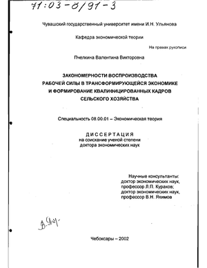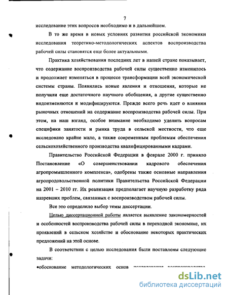 Целью диссертационной работы является выявление закономерностей и особенностей воспроизводства рабочей силы в переходной экономике, их проявлений в сельском хозяйстве и обоснование некоторых практических предложений на этой основе.