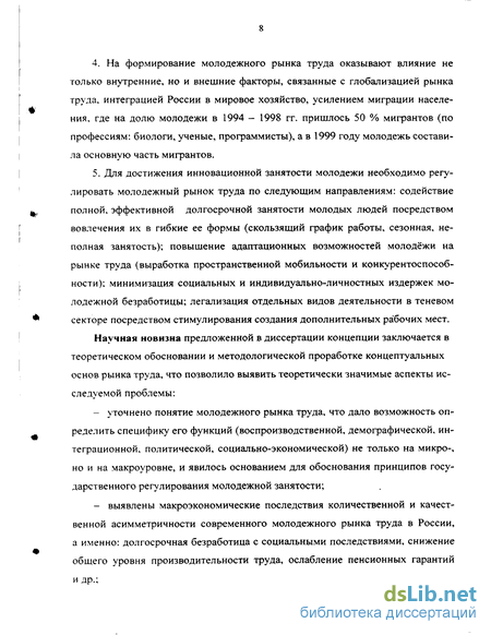 Теоретическая и практическая значимость работы. Уточнено понятие молодежного рынка труда и выделены критерии его сегментации, предложена классификация методов государственного регулирования, выявлено содержание инновационного типа занятости молодежи. Ряд выводов представляет определенный интерес для оценки и обоснования экономической политики государства. Материалы диссертации могут быть использованы в процессе преподавания дисциплин: «Экономическая теория», «Экономика и социология труда», а также спецкурса «Занятость и безработица».