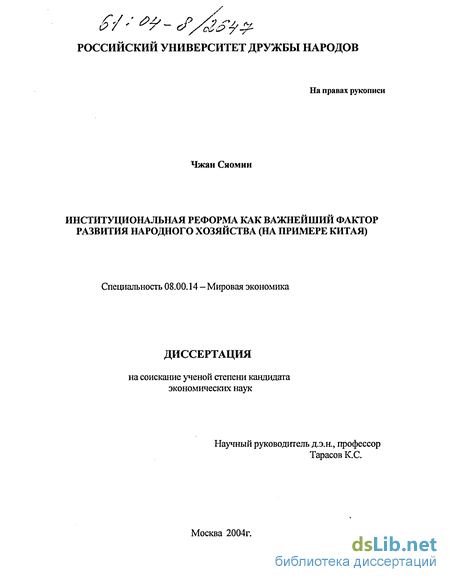 Объектом исследования является экономика (народное хозяйство) Китая. Аспектом исследования является выявление роли институциональных реформ в росте и развитии этой экономики (народного хозяйства). При этом упор делается на институционально-экономической реформе.