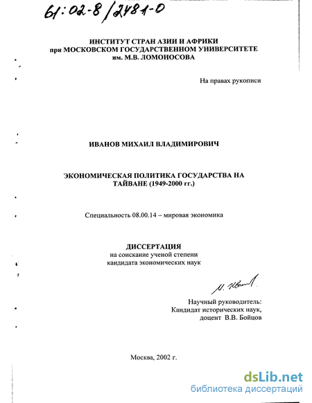 Особенности экономического и социального развития Тайваня заслуживают пристального внимания, прежде всего в контексте проводимых сегодня в России экономических реформ. Руководство Тайваня на протяжении пяти десятилетий (1949-2000гг.) убедительно демонстрировало эффективность централизованного начала в создании и организации экономической системы, ее внутренней структуры, а также ее интеграции в мировое хозяйство.