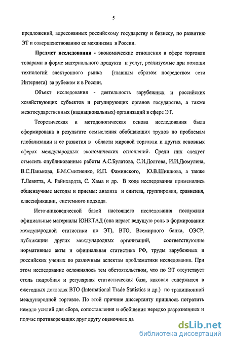 нормативные акты и официальная статистика РФ, труды зарубежных и российских ученых по различным аспектам проблематики исследования. При этом исследование осложнялось тем обстоятельством, что по ЭТ отсутствует столь подробная и регулярная статистическая база, каковая содержится в ежегодных докладах ВТО (International Trade Statistics и др.) по традиционной международной торговле. По этой причине диссертанту пришлось потратить немало усилий для сбора, сопоставления и обобщения нередко разрозненных и подчас противоречащих друг другу оценочных данных и сведений по ЭТ.