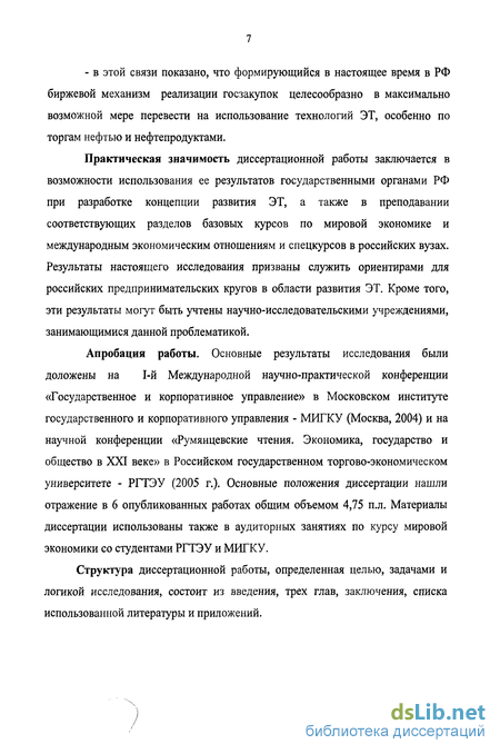 Апробация работы. Основные результаты исследования были доложены на 1-й Международной научно-практической конференции «Государственное и корпоративное управление» в Московском институте государственного и корпоративного управления - МИГКУ (Москва, 2004) и на научной конференции «Румянцевские чтения. Экономика, государство и общество в XXI веке» в Российском государственном торгово-экономическом университете - РГТЭУ (2005 г.). Основные положения диссертации нашли отражение в 6 опубликованных работах общим объемом 4,75 п.л. Материалы диссертации использованы также в аудиторных занятиях по курсу мировой экономики со студентами РГТЭУ и МИГКУ.