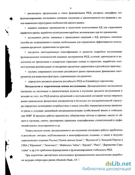 построено на системном и диалектическом подходе к изучению предмета исследования и исходит из того, что РКД является органичной и неотъемлемой составной частью мирового рынка производных финансовых инструментов и богатство его инструментальной структуры определено возникшими потребностями в новых способах перераспределения кредитного риска в условиях дальнейшей интернационализации хозяйственной жизни и глобализации МФР. В процессе работы применялись общенаучные методы и приемы: анализ от общего к частному, синтез, группировки, сравнения, классификации, статистический и графический анапиз, моделирование и др.
