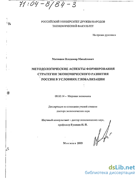 Степень научной разработанности темы. Исследованию проблем формирования стратегии экономического развития России в условиях глобализации посвящены работы видных российских ученых (Абалкин Л., Глазьев С, Гранберг А., Ивантер В., Илларионов А., Львов Д., Кочетов Э., Федоренко Н., Шохин А., Ясин Е. и многие другие). Данные проблемы волнуют крупнейших государственных деятелей страны. Наиболее отчетливо необходимость новых стратегических разработок и исследований, с нашей точки зрения, выразил В. Сенчагов. В этой связи он писал: «России нужно новое качество стратегического управления и планирования как на макро-, так и на корпоративном уровне. Именно в этом — главный вызов России со стороны набирающего темпы процесса глобализации. Перед Россией стоит задача создать современные финансово-банковскую систему, институты рыночного хозяйства, механизмы корпоративного управления, чтобы обеспечить благоприятные условия для отечественных товаропроизводителей, как на внутреннем, так и на внешнем рынке» .