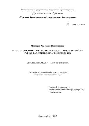 Цель и задачи диссертационного исследования. Целью диссертации является развитие теоретико-методологических положений международной кооперации на рынке пассажирских авиаперевозок и разработка стратегических направлений повышения конкурентоспособности различных форм кооперации лоукост-авиакомпаний в условиях нестабильности отрасли.