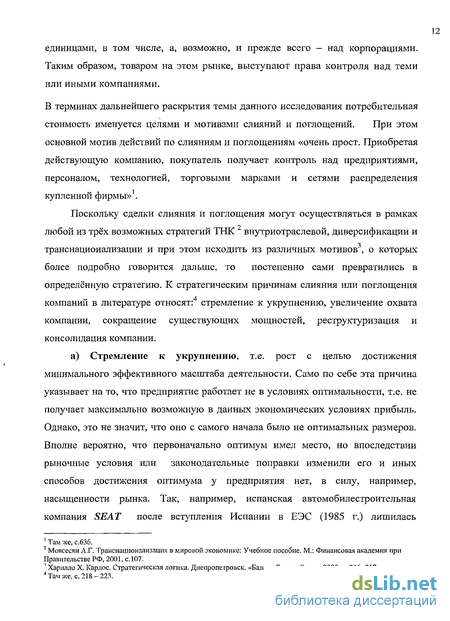 Стремление к укрупнению, т.е. рост с целью достижения минимального эффективного масштаба деятельности. Само по себе эта причина указывает на то, что предприятие работает не в условиях оптимальности, т.е. не получает максимально возможную в данных экономических условиях прибыль. Однако, это не значит, что оно с самого начала было не оптимальных размеров. Вполне вероятно, что первоначально оптимум имел место, но впоследствии рыночные условия или законодательные поправки изменили его и иных способов достижения оптимума у предприятия нет, в силу, например, насыщенности рынка. Так, например, испанская автомобилестроительная компания SEAT после вступления Испании в ЕЭС (1985 г.) лишилась поддержки своей страны в виде дискриминационных барьеров для импортных автомобилей и в конце концов была поглощена (с доплатой в 2 млрд.) Volkswagen.1 Ситуация, аналогичная этой в настоящее время складывается и в российском автопроме из-за всё возрастающей конкуренции с импортными автомобилями.
