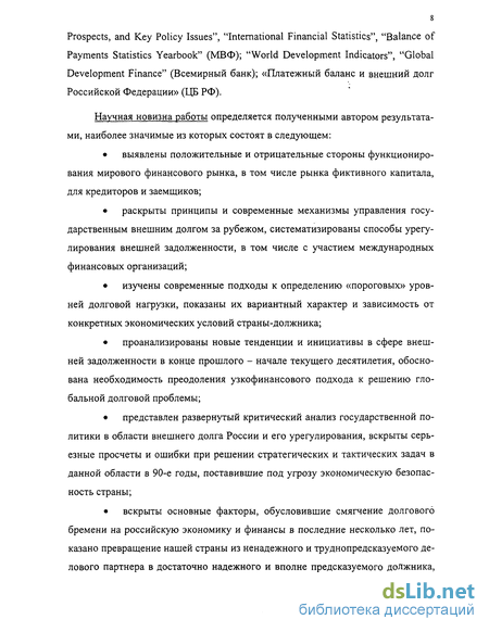 Практическая значимость исследования. Диссертация содержит рекомендации относительно наиболее эффективных путей решения проблемы российской внешней задолженности как с точки зрения текущих задач, так и долгосрочной стратегии развития страны. Автором предложены конкретные меры законодательного и организационного характера по совершенствованию государственной политики в сфере внешних заимствований.
