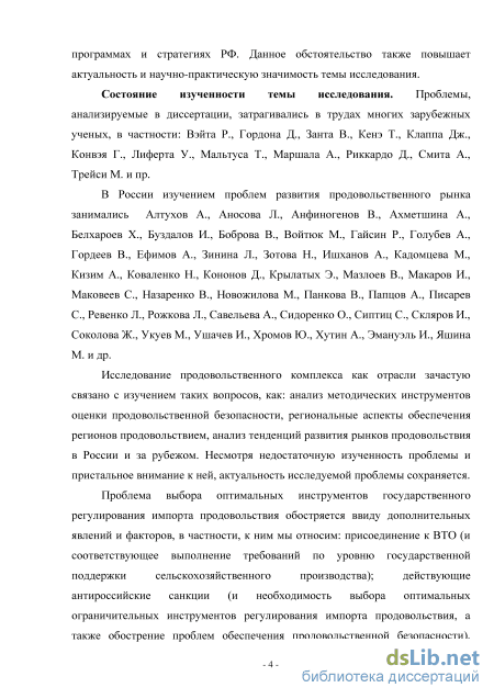 Информационной и источниковедческой базой исследования явились труды и разработки ведущих научно-исследовательских организаций и вузов страны по анализируемым в диссертации проблемами (Российский аграрный университет им. К.А. Тимирязева, Институт аграрных проблем РАН, Институт конъюнктуры аграрного рынка, Московский государственный университет им. Ломоносова, Институт аграрного маркетинга, Всероссийская академия внешней торговли, Российский университет дружбы народов, Московский государственный институт международных отношений (Университет) МИД РФ, Российская таможенная академия). В качестве статистической базы исследования использовались материалы Всемирной продовольственной и сельскохозяйственной организации ООН (ФАО), Всемирной торговой организации (ВТО), Федеральной службы государственной статистики (Росстат).