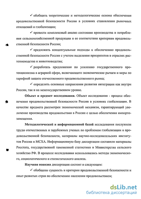 Методологической и информационной базой исследования послужили труды отечественных и зарубежных ученых по проблемам глобализации и продовольственной безопасности, материалы научно-исследовательских институтов России и МСХА. Информационную базу диссертации составили материалы Росстата, государственной таможенной статистики и Министерства сельского хозяйство РФ. В процессе исследования использовались методы экономического, социологического и статистического анализа.