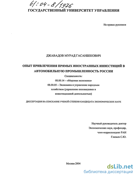 Апробация работы. Основные положения диссертационного исследования обсуждены и одобрены на заседаниях кафедры мировой экономики Государственного университета управления, научно-практических конференциях «Реформы в России и проблемы управления», «Актуальные проблемы управления-2003», публикациях автора.