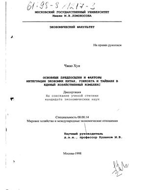 Предмет исследования. Предметом исследования при написании данной диссертации явились экономико-политические основы сближения КНР, Тайваня и Гонконга, а также перспективы сотрудничества "Большого Китая" с сопредельными государствами.