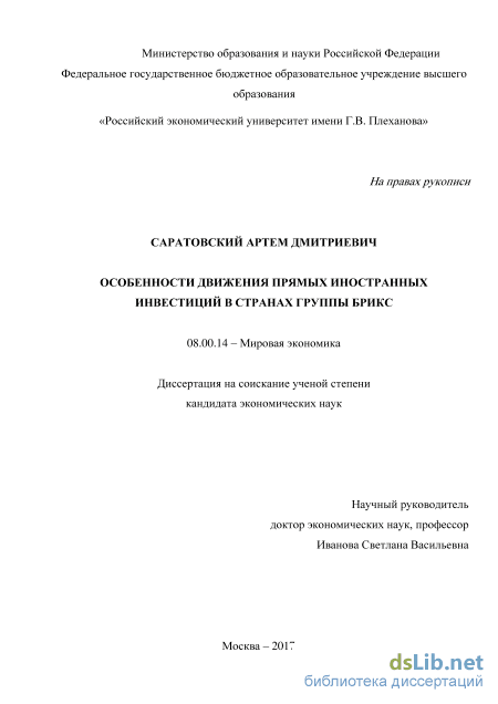 Предмет диссертационного исследования. Предметом исследования являются тенденции и последствия перемещения прямых иностранных инвестиций в/из стран группы БРИКС, а также характеристики и эффективность заключаемых с участием компаний «группы пяти» сделок слияний и поглощений, как одной из значимых форм международного инвестиционного капитала.