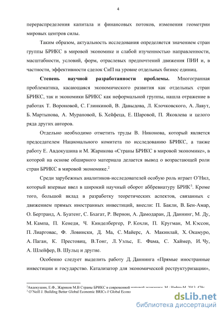 Среди зарубежных аналитиков-исследователей особую роль играет О’Нил, который впервые ввел в широкий научный оборот аббревиатуру БРИКС3. Кроме того, большой вклад в разработку теоретических аспектов, связанных с движением прямых иностранных инвестиций, внесли: П. Бакли, В. Бен-Амар, О. Бертранд, А. Буатенг, С. Бхагат, Р. Вернон, А. Дамодаран, Д. Даннинг, М. Ду, М. Кампа, П. Кенеди, Ч. Кинделбергер, Р. Кохли, П. Кругман, М. Кэссон, П. Лиарговас, Ф. Ловински, Д. Ма, С. Майерс, А. Макинлай, Х. Окамуро, А. Паган, К. Престовиц, В.Тонг, Л. Уэльс, Е. Фама, С. Хаймер, И. Чу, А. Шлейфер, В. Шульц и другие.