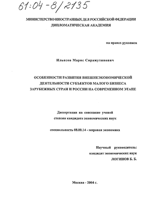 Предмет исследования — особенности внешнеэкономической деятельности субъектов малого предпринимательства зарубежных стран и России.