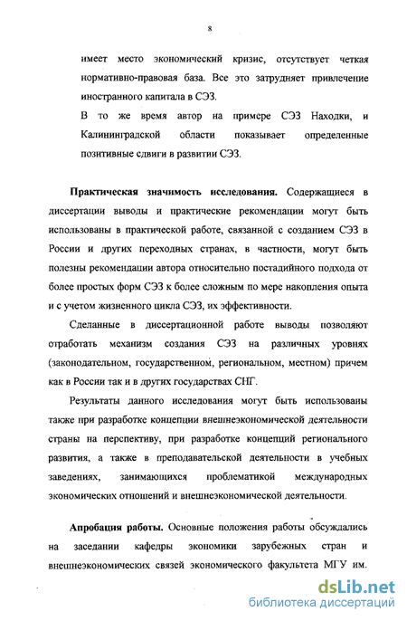 Практическая значимость исследования. Содержащиеся в диссертации выводы и практические рекомендации могут быть использованы в практической работе, связанной с созданием СЭЗ в России и других переходных странах, в частности, могут быть полезны рекомендации автора относительно постадийного подхода от более простых форм СЭЗ к более сложным по мере накопления опыта и с учетом жизненного цикла СЭЗ, их эффективности.
