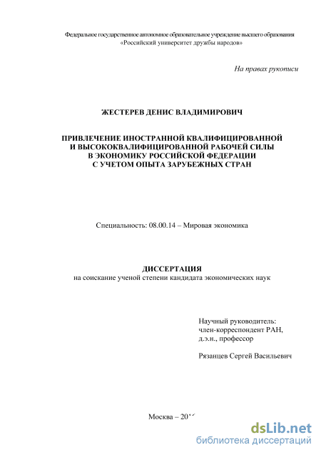 Объектом исследования в настоящей работе являются миграция иностранной квалифицированной и высококвалифицированной рабочей силы в Россию и процессы ее использования в российской экономике.