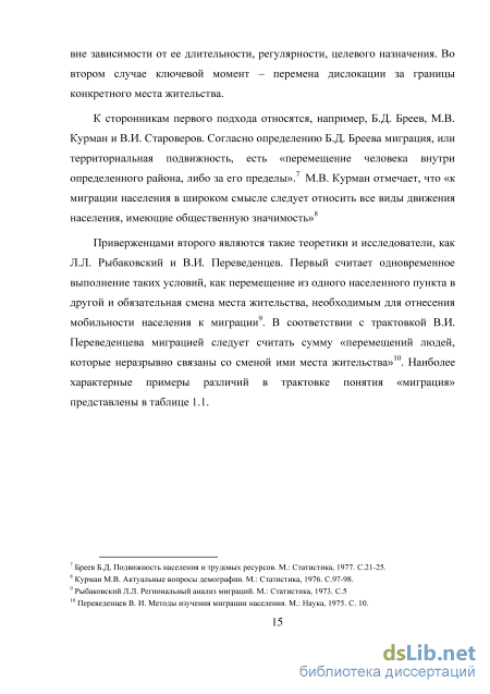 К сторонникам первого подхода относятся, например, Б.Д. Бреев, М.В. Курман и В.И. Староверов. Согласно определению Б.Д. Бреева миграция, или территориальная подвижность, есть «перемещение человека внутри определенного района, либо за его пределы».7 М.В. Курман отмечает, что «к миграции населения в широком смысле следует относить все виды движения населения, имеющие общественную значимость»8