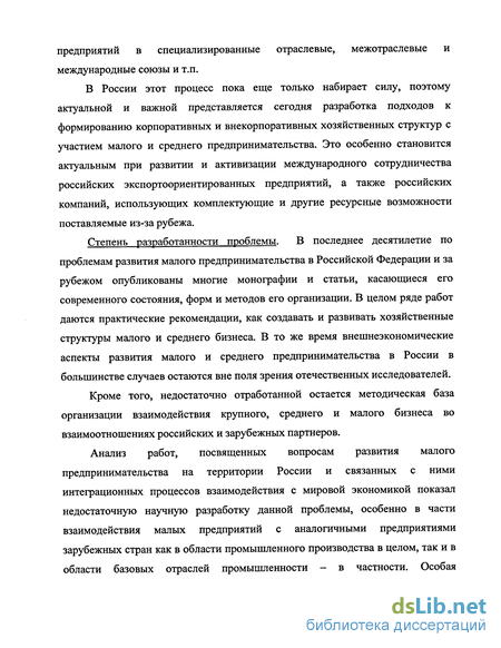 Степень разработанности проблемы. В последнее десятилетие по проблемам развития малого предпринимательства в Российской Федерации и за рубежом опубликованы многие монографии и статьи, касающиеся его современного состояния, форм и методов его организации. В целом ряде работ даются практические рекомендации, как создавать и развивать хозяйственные структуры малого и среднего бизнеса. В то же время внешнеэкономические аспекты развития малого и среднего предпринимательства в России в большинстве случаев остаются вне поля зрения отечественных исследователей.