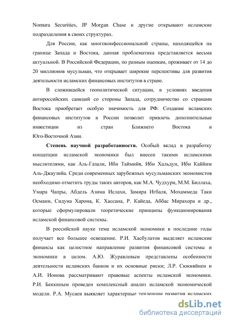 В российской науке тема исламской экономики в последние годы получает все большее освещение. Р.И. Хасбулатов выделяет исламские финансы как целостное направление развития финансовой системы и экономики в целом. А.Ю. Журавлевым представлены особенности деятельности исламских банков и их основные риски. Л.Р. Сюкияйнен и А.И. Ионова рассматривают правовые аспекты исламской экономики. Р.И. Беккиным проведен комплексный анализ исламской экономической модели. Р.А. Мусаев выявляет характерные тенденции развития исламских финансовых институтов в условиях глобализации. Специфические черты исламского бизнеса нашли отражение в публикациях М.Э. Калимуллиной. С.К. Искаков оценивает возможности эмиссии исламских облигаций российскими эмитентами. Б.В. Чокаев и М.И. Яндиев отмечают характерные особенности исламской финансовой системы в современных условиях.