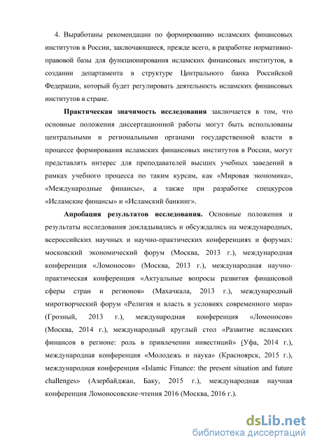 Апробация результатов исследования. Основные положения и результаты исследования докладывались и обсуждались на международных, всероссийских научных и научно-практических конференциях и форумах: московский экономический форум (Москва, 2013 г.), международная конференция «Ломоносов» (Москва, 2013 г.), международная научно-практическая конференция «Актуальные вопросы развития финансовой сферы стран и регионов» (Махачкала, 2013 г.), международный миротворческий форум «Религия и власть в условиях современного мира» (Грозный, 2013 г.), международная конференция «Ломоносов» (Москва, 2014 г.), » (Уфа, 2014 г.), международная конференция «Молодежь и наука» (Красноярск, 2015 г.), международная конференция «Islamic Finance: the present situation and future challenges» (Азербайджан, Баку, 2015 г.), международная научная конференция Ломоносовские-чтения 2016 (Москва, 2016 г.).