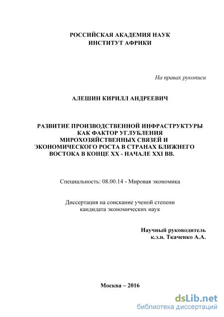 Так, в исследованиях коллектива авторов ИАфр РАН «Экономическая инфраструктура стран Африки» (2012), ведущих ученых ИВ РАН В.А. Исаева и А.О. Филоника «Королевство Бахрейн» (2006) и «Кувейт и кувейтцы в современном мире» (2003), А.О. Филоника и А.И. Яковлева «Объединенные Арабские Эмираты» (2004), И.М.Могилевкина «Глобальная инфраструктура: механизм движения в будущее» (2010) и «Глобальные инфраструктуры в мировой экономике: долгосрочные тенденции, интересы России» (2007), Э.О.Касаева «Катар в ХХI веке: современные тенденции и прогнозы экономического развития» (2013), в справочниках «Арабская Республика Египет» (1991), «Королевство Саудовская Аравия» (2006) и других страновых исследованиях проанализированы вопросы формирования инфраструктуры, которые представляют особый интерес в рамках исследуемой темы диссертации.
