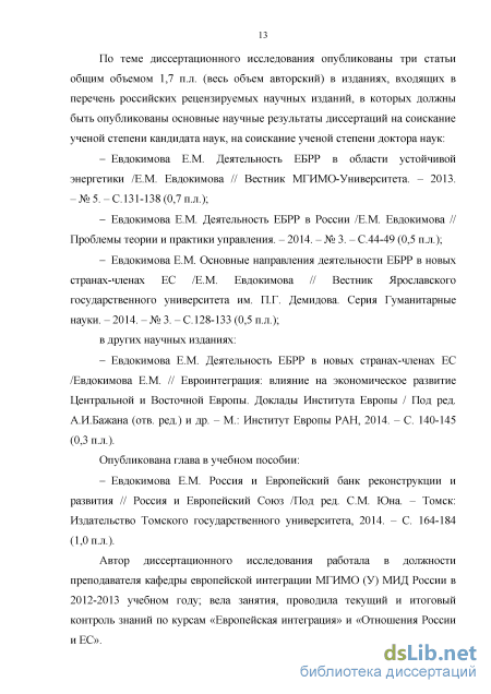 Автор диссертационного исследования работала в должности преподавателя кафедры европейской интеграции МГИМО (У) МИД России в 2012-2013 учебном году; вела занятия, проводила текущий и итоговый контроль знаний по курсам «Европейская интеграция» и «Отношения России и ЕС».