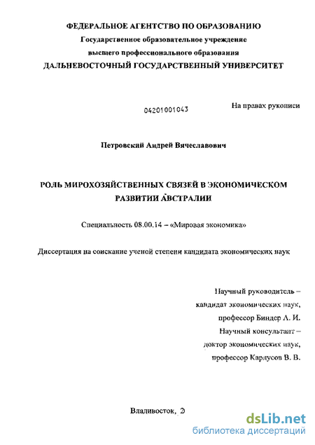 Научная новизна диссертационного исследования определяется тем, что работа прелставляет собой одну из первых в российской научной литературе попыток комплексного изучения места и роли мирохозяйственных связей в экономическом развитии современной Австралии.