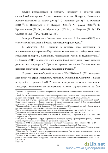 Некоторые авторы выделяют экономических лидеров (либо одно ядро) в отдельных интеграционных объединениях. Т. Чеклина (2010) считает, что «более успешно интеграционное сотрудничество развивается при наличии экономически сильного лидера: в МЕРКОСУР – Бразилии, В ЮАТС – ЮАР, в ССАГПЗ – Саудовской Аравии».34 Те же самые примеры выделял В. Шеров-Игнатьев (2014), добавляя к ним действовавший в тот момент времени Таможенный союз России, Беларуси и Казахстана.35 М. Фонарёв (2013) в рамках Европейского Союза считает лидером Германию и Францию, в рамках Евразийского Союза – Россию, Беларусь и Казахстан.36 Искаков И. (2015) считает ядром евразийской интеграции Россию.37 А. Елецкий (2014) выделяет в рамках МЕРКОСУР ядро не из нескольких стран, а из одной (Бразилия).38 В. Колташов (2013) считает Южноафриканскую республику ядром Южноафриканского таможенного союза.39