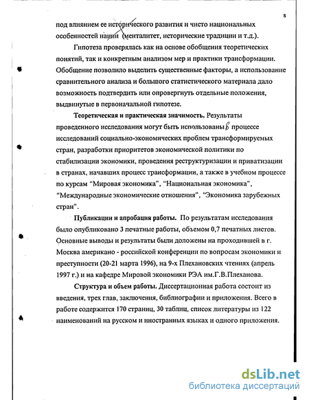 Публикации и апробация работы. По результатам исследования было опубликовано 3 печатные работы, объемом 0,7 печатных листов. Основные выводы и результаты были доложены на проходившей в г. Москва американо - российской конференции по вопросам экономики и преступности (20-21 марта 1996), на 9-х Плехановских чтениях (апрель 1997 г.) и на кафедре Мировой экономики РЭА им.Г.В.Плеханова.