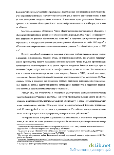 Болонского процесса. Его создание преследовало политические, экономические и собственно научно-образовательные цели. Научно-образовательной целью явилось обновление знаний и идей за счет расширения международных контактов. В настоящее время участниками Болонского процесса и декларации «Зона европейского высшего образования» являются 45 стран, в том числе и Россия.