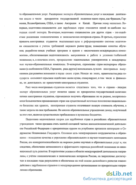 та образовательных услуг. Расширение экспорта образовательных услуг в последние десятилетия вошло в число приоритетов государственной политики таких стран, как Франция, Германия, Великобритания, США, а также Австралия и Китай. Причин этому несколько. Во-первых, подготовка специалистов для зарубежных стран становится одной из наиболее выгодных статей экспорта. Во-вторых, подготовка специалистов для других стран - это содействие реализации геополитических и экономических интересов страны. В-третьих, стремлеіше привлечь иностранных студентов подталкивает вузы к реформированию системы подготовки специалистов с учетом требований мирового рынка труда; повышению качества обучения; разработке новых учебных программ и курсов с «включением международных компонентов», обеспечивающих подготовлеішость выпускников к работе в условиях глобальной экономики; и, в конечном итоге, превращению национальных университетов в международные научно-образовательные комплексы. В-четвертых, стремление стран-экспортеров образования (в особенности США, Германии, ряда других) использовать лучших иностранных выпускников для развития экономики и науки своих стран. Исходя из этого, правительства ряда государств оказывают серьезное содействие своим вузам, стимулируют, в том числе и финансово, их деятельность по привлечению иностранных студентов.
