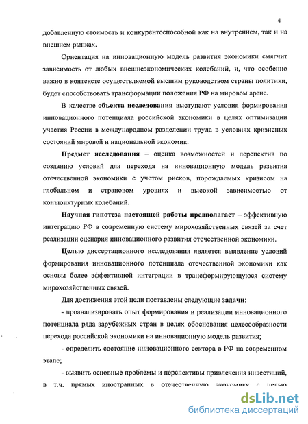 Целью диссертационного исследования является выявление условий формирования инновационного потенциала отечественной экономики как основы более эффективной интеграции в трансформирующуюся систему мирохозяйственных связей.