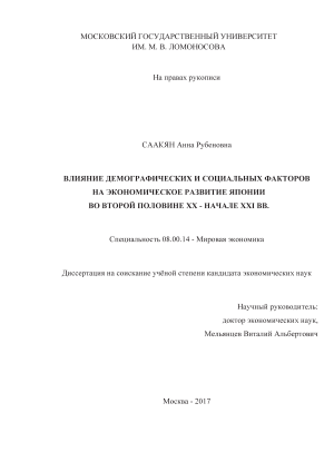 Объектом диссертационного исследования выступает экономическое развитие Японии в контексте демографических и социальных изменений.