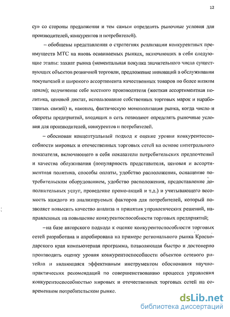 -раскрыто содержание конкурентных преимуществ МТС как объектов сетевого ритейла, произведена их классификация на общие (извлечение эффекта масштаба, оптимизация ассортиментной и ценовой политики, высокое качество обслуживания, получение скидок при массовых закупках товаров) и специфические (возможность направленного воздействия на рыночную среду через продвижение сетевых стандартов и собственных брендов, высокую централизацию функций логистики и дистрибуции, способность за счет масштабного вложения финансовых средств создавать на рыночном сегменте «критическую маесу» со стороны предложения и тем самым определять рыночные условия для производителей, конкурентов и потребителей).
