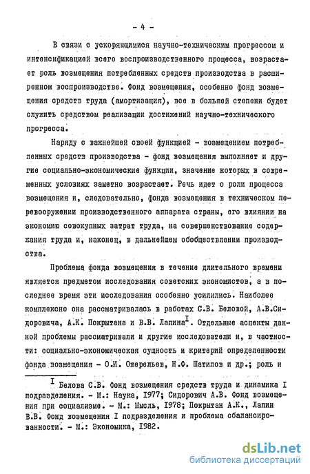 Проблема фонда возмещения в течение длительного времени является предметом исследования советских экономистов, а в последнее время эти исследования особенно усилились. Наиболее комплексно она рассматривалась в работах СВ. Беловой, А.В.Си-доровича, А.К. Покрыгана и В.В. Лапина . Отдельные аспекты данной проблемы рассматривали и другие исследователи и, в частности: социально-экономическая сущность и критерий определенности фонда возмещения - О.И. Ожерельев, Н.Ф. Шатилов и др.; роль и