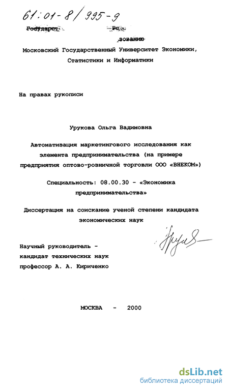 Автоматизация маркетингового исследования как элемента предпринимательской деятельности.