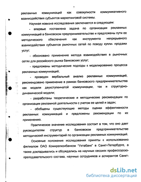 - впервые поставлена задача по организации рекламных коммуникаций в банковском предпринимательстве и предложены пути ее методического обеспечения как инструмента непрерывного взаимодействия субъектов рыночных сетей по поводу купли- продажи услуг;