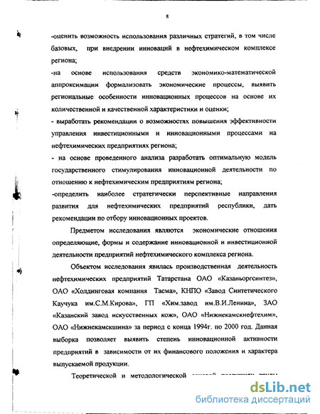 -провести анализ факторов, определяющих инновационную активность предприятий в современной экономической среде и определить степень влияния стратегического планирования на инновационные процессы; -проанализировать рыночные условия функционирования предприятий нефтехимического комплекса региона, их инновационную деятельность, выявить факторы, определяющие финансовое состояние и степень инновационной активности;