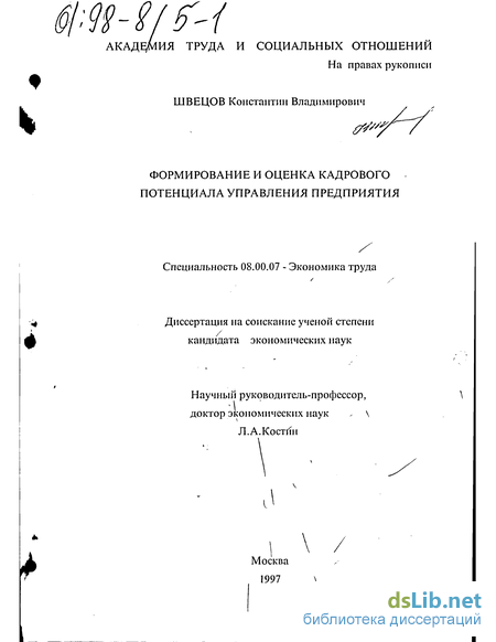 Актуальность и многогранность стоящих перед предприятиями проблем формирования и эффективного использования кадрового потенциала управления, недостаточная их разработанность предопределила выбор темы диссертационного исследования.