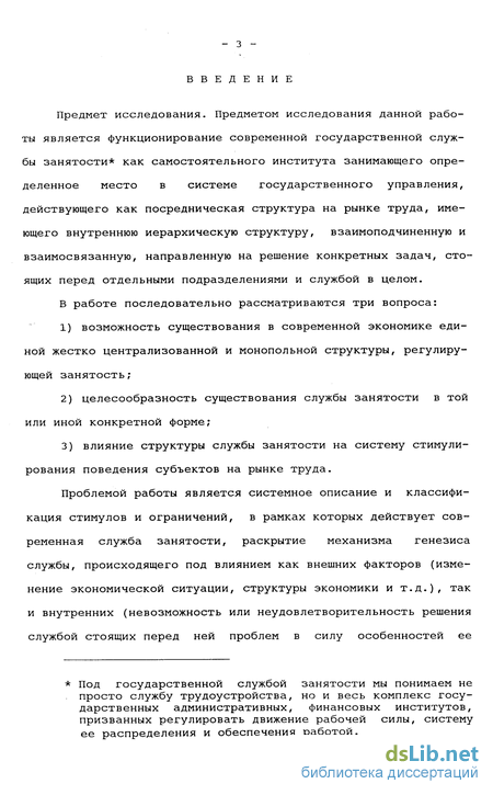 Необходимо отметить, что в современной научной литературе проблема Функционирования службы занятости затрагивается лишь постольку, поскольку она касается более общих тем исследования: борьба с безработицей, регулирование рынка труда, финансирование социальных программ и т.д. Но, на наш взгляд, решение всех этих вопросов невозможно без тщательного исследования инструмента, в помощь которого они могут быть решены. Одним из таких инструментов является институт службы занятости, действующий на рынке труда и оказывающий на него большее или меньшее, в зависимости от делегируемых ему государством и органами общественного самоуправления полномочий, воздействие.