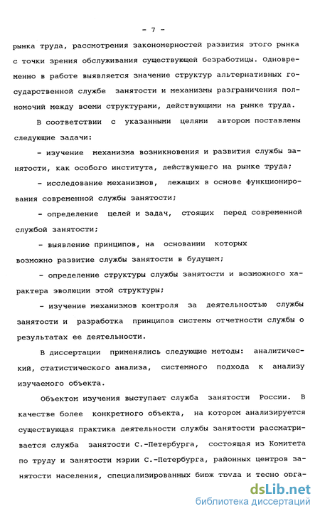 Целью диссертационной работы является исследование закономерностей развития института службы занятости, для выявления места и роли службы занятости в решении вопросов регулирования рынка труда, рассмотрения закономерностей развития этого рынка с точки зрения обслуживания существующей безработицы. Одновременно в работе выявляется значение структур альтернативных государственной службе занятости и механизмы разграничения полномочий между всеми структурами, действующими на рынке труда.