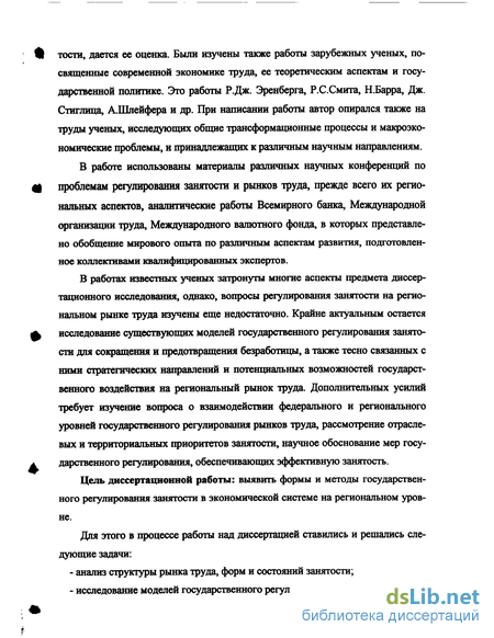 Цель диссертационной работы: выявить формы и методы государственного регулирования занятости в экономической системе на региональном уровне.