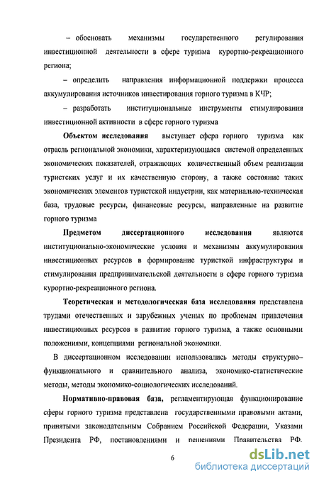 Цели и задачи исследования. Целью диссертационного исследования является теоретическое обоснование и разработка институционально-экономических условий и механизмов аккумуляции инвестиционных ресурсов в развитие горнолыжных курортов регионов России, и прежде всего Северного Кавказа, и Карачаево-Черкесской республики.